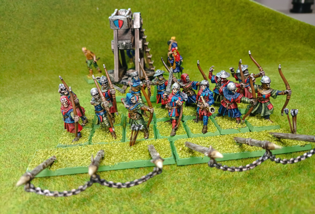 Trebuchet którego niestety zdjęcie mam tylko z łucznikami, to wydruk 3d. Prosta maszyna bojowa z chłopstwem. Wieść gminna niesie że najodważniejsi generałowie kupują do niej sołtysa aby lepiej strzelała.
