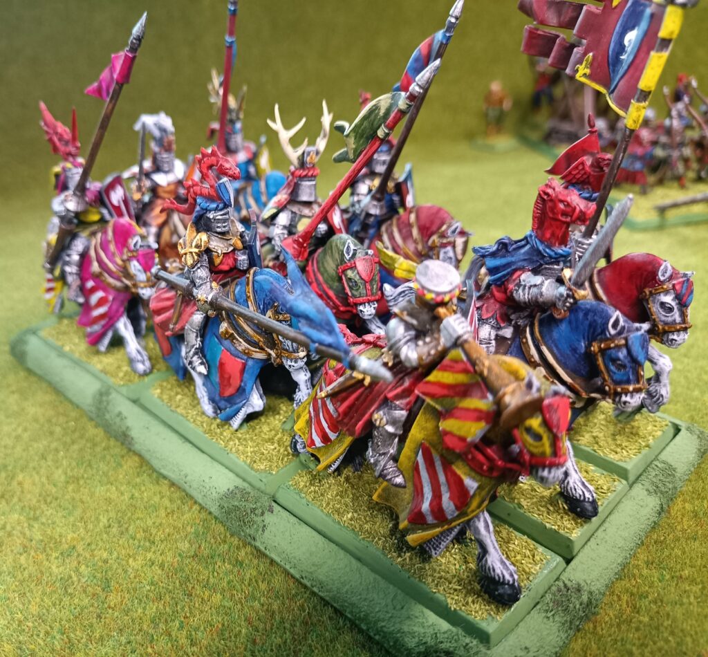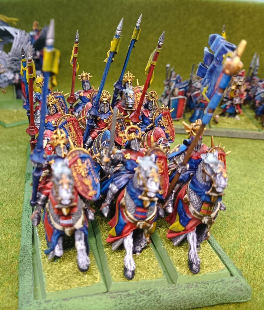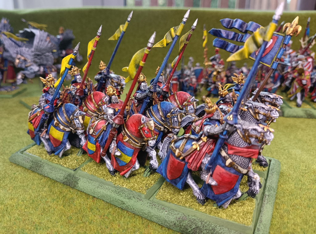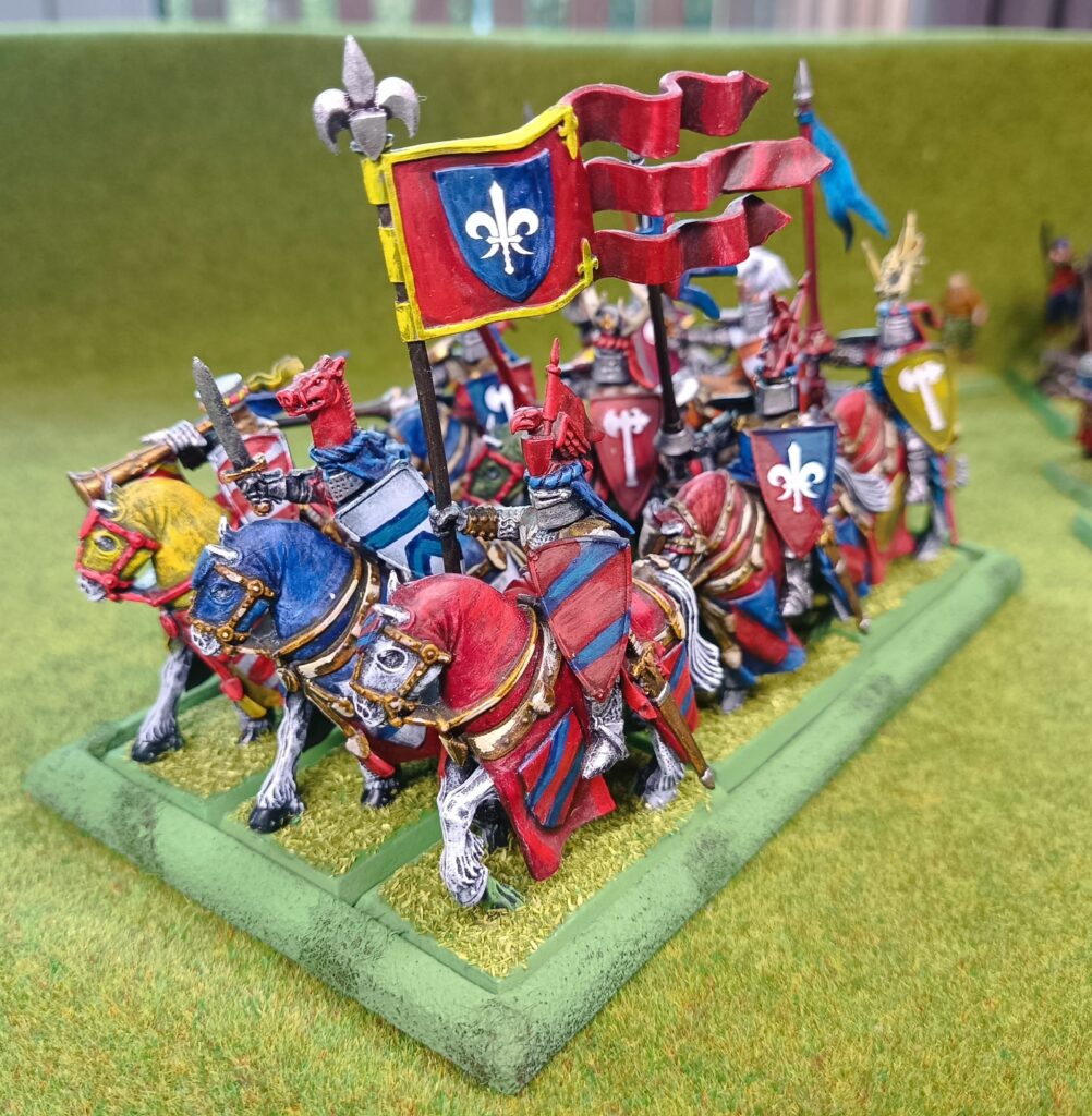 Ikona armii Bretońskiej. Najbardziej charakterystyczna jednostka. Rycerstwo, poczet rycerstwa. Każdy rycerz z innego rodu, pod swoimi barwami. Każda heraldyka inna. I cholera malować każdego trzeba osobno, nie hurtem jak to zawsze robię.