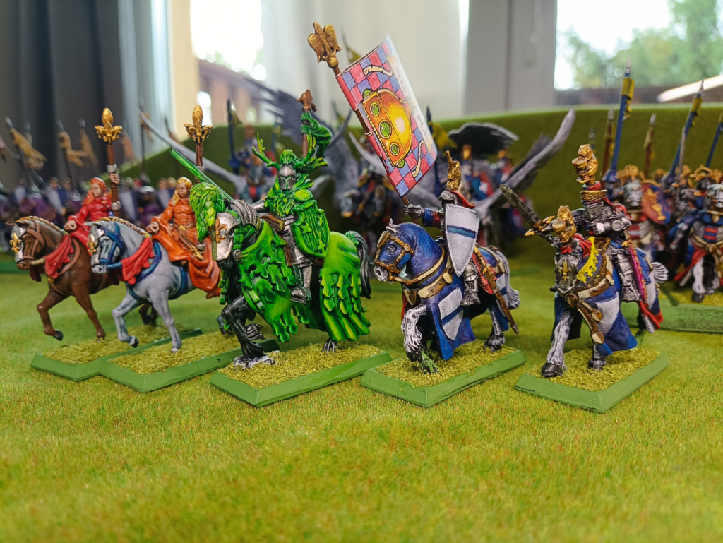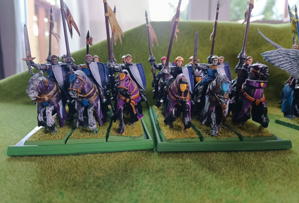 Kupiłem używane modele Knights of Realm którzy byli średnio przygotowani. Wymieniłem głowy, dodałem tarcze, paru podmalowałem ręce. Dostałem ich pomalowanych już na fioletowo. Wstępnie ten element kolorystyczny pasował mi i odcinał ich jako biedniejszą wersję szat dla rycerstwa co wspiera narrację armi. Erranci to niższe rycerstwo przez co nie zastanawiałem się długo nad ich „dopieszczeniem”. Tarcze i heraldyka to połaczenie niebieskiego i białego.